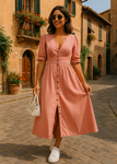 De knoopsluiting geeft je de vrijheid om zelf te kiezen hoe speels of gesloten je de jurk draagt, zonder dat het tekent op je buik. -